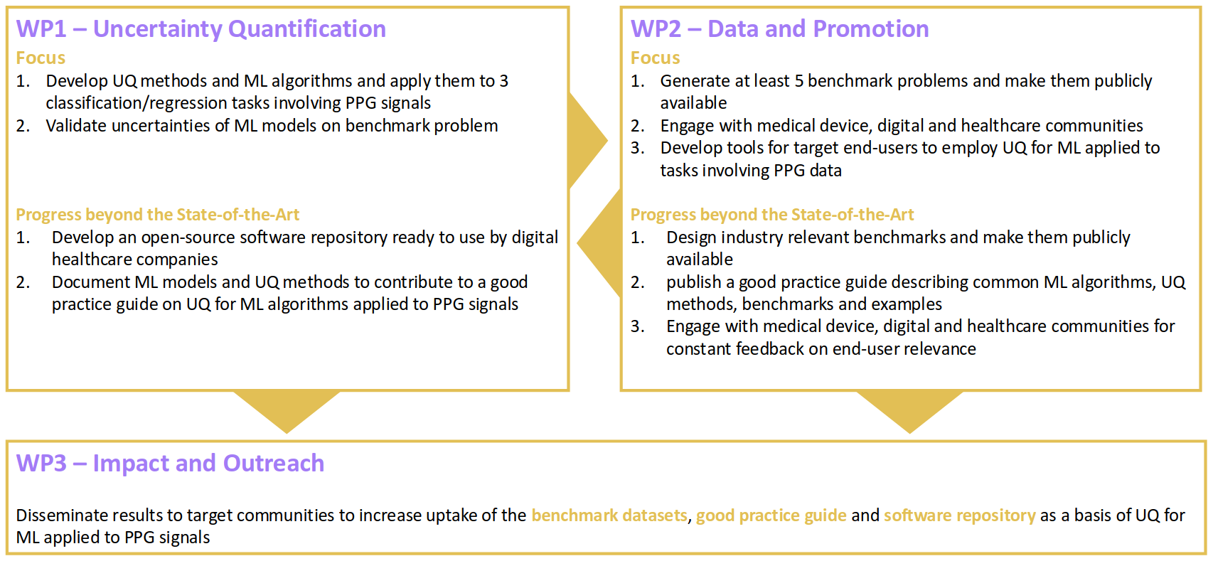 The aim of this work package is to develop methods for quantifying the uncertainty in supervised machine learning and deep learning models to enable the performance of at least 3 classification and 3 regression tasks involving PPG data, considering the effects of both aleatoric (data) and epistemic (model) uncertainty on model predictions. Conventionally, one divides the total predictive uncertainty into aleatoric and epistemic uncertainty. Aleatoric uncertainty represents the noise inherent in the observed data, whereas epistemic uncertainty accounts for the uncertainty in the model, i.e., uncertainty which can usually be explained away given more data. A common framework will be developed to evaluate the performance of trained models and to quantify and validate the uncertainties obtained for those models, thus permitting the accuracy and uncertainty of models to be compared, and models with high accuracy and low uncertainty to be identified.